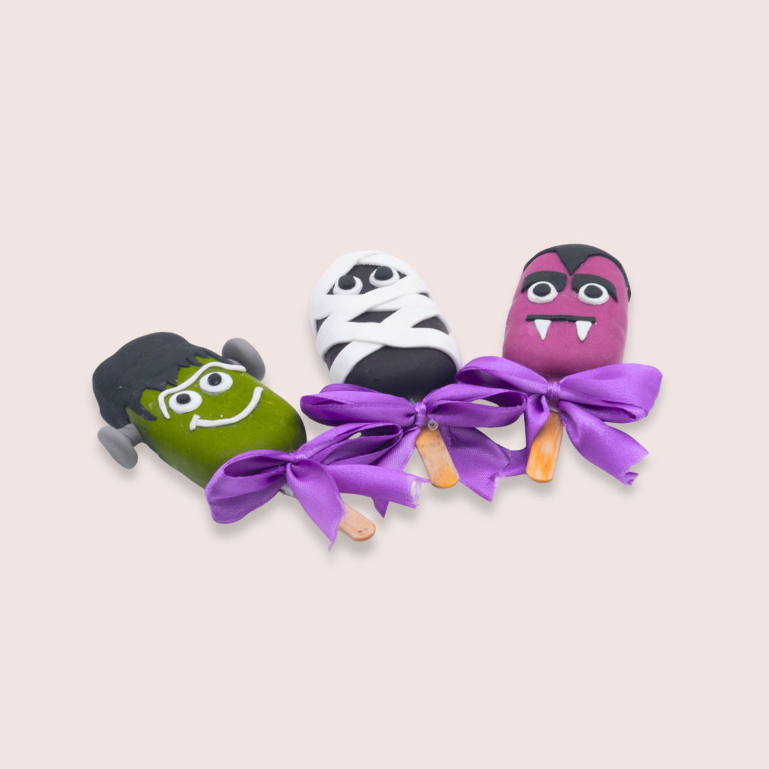 Spooky never tasted so sweet! Our Halloween Cakesicle Set features three frightfully fun characters — Frankie, Count Dracula, and a cheeky little Mummy. Each cakesicle is dipped, decorated, and dressed up with fondant details, making them the perfect grab-and-go treat for kids and grown-ups alike.