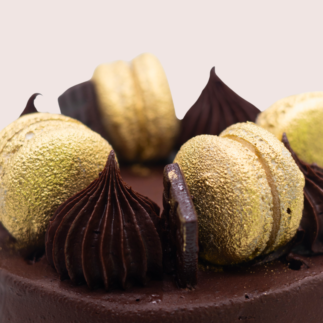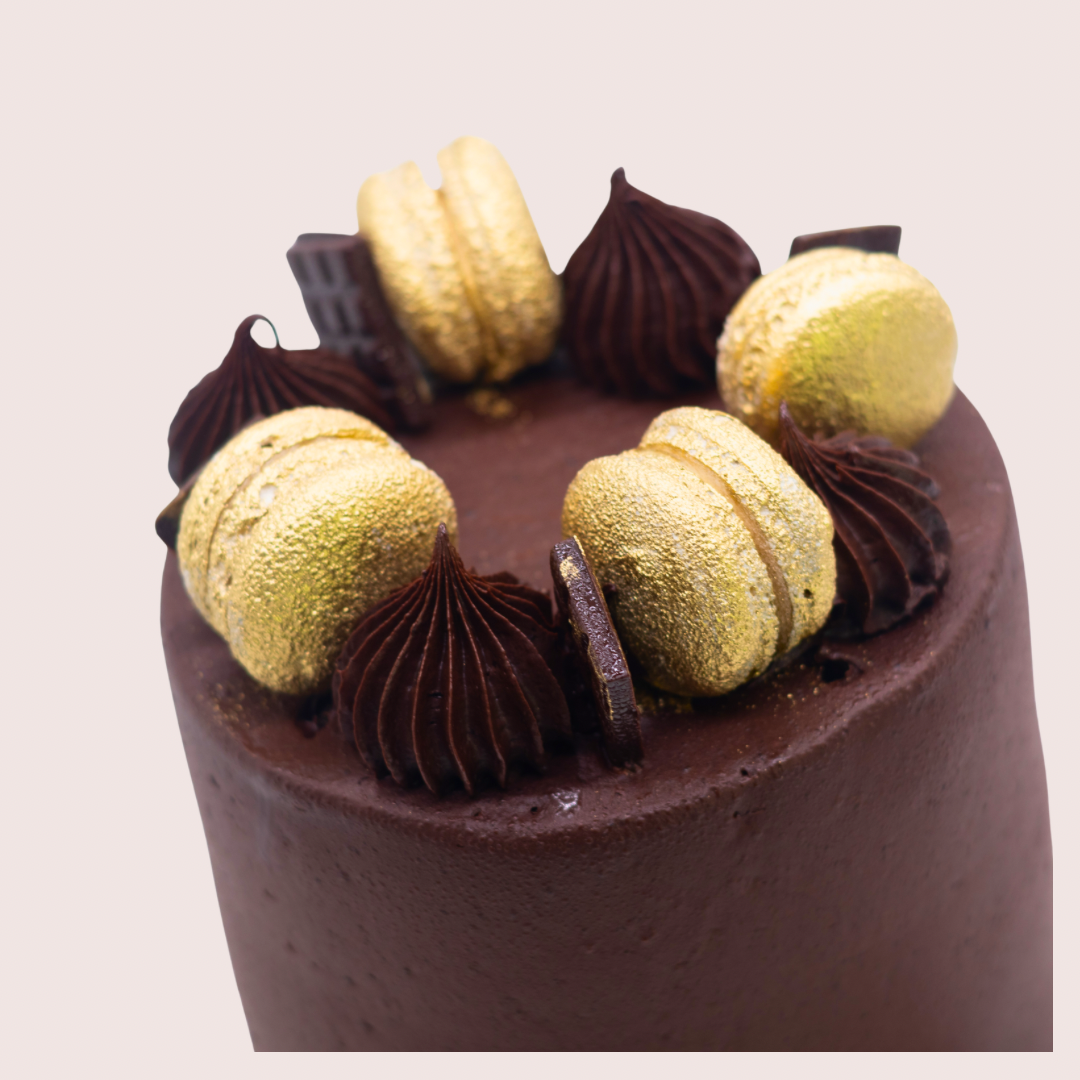 Layers of rich and moist chocolate cake filled and covered in a decadent chocolate cream cheese buttercream and decorated with gold sprinkles, gold splatters and mini chocolate slabs.