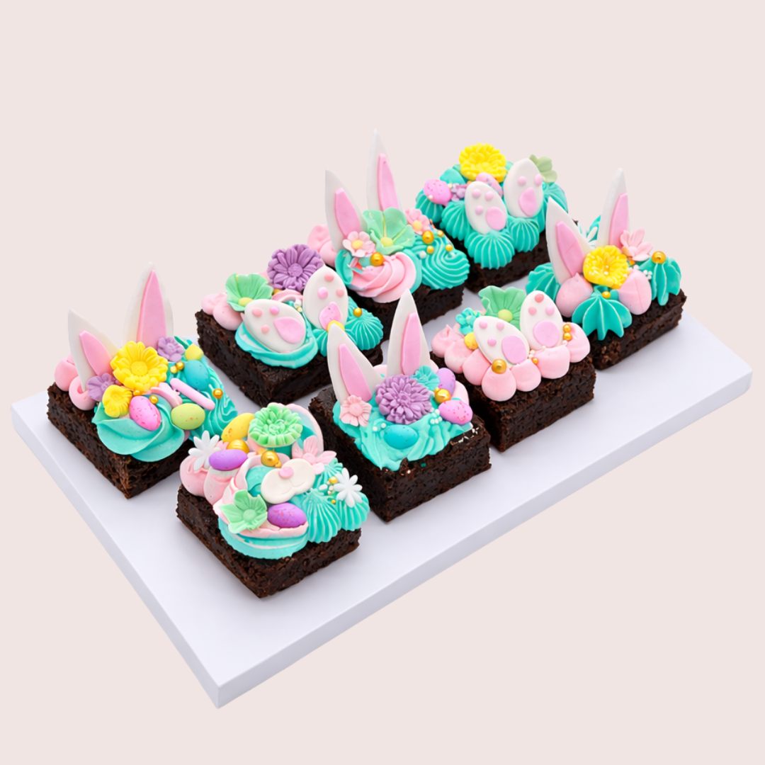 Our Easter Brownie Box is a deliciously indulgent collection of rich, fudgy brownies beautifully decorated with festive Easter designs. Each brownie is baked using our signature chocolate brownie recipe and topped with smooth buttercream, pastel colours, bunny ears, mini eggs, and handcrafted fondant decorations.