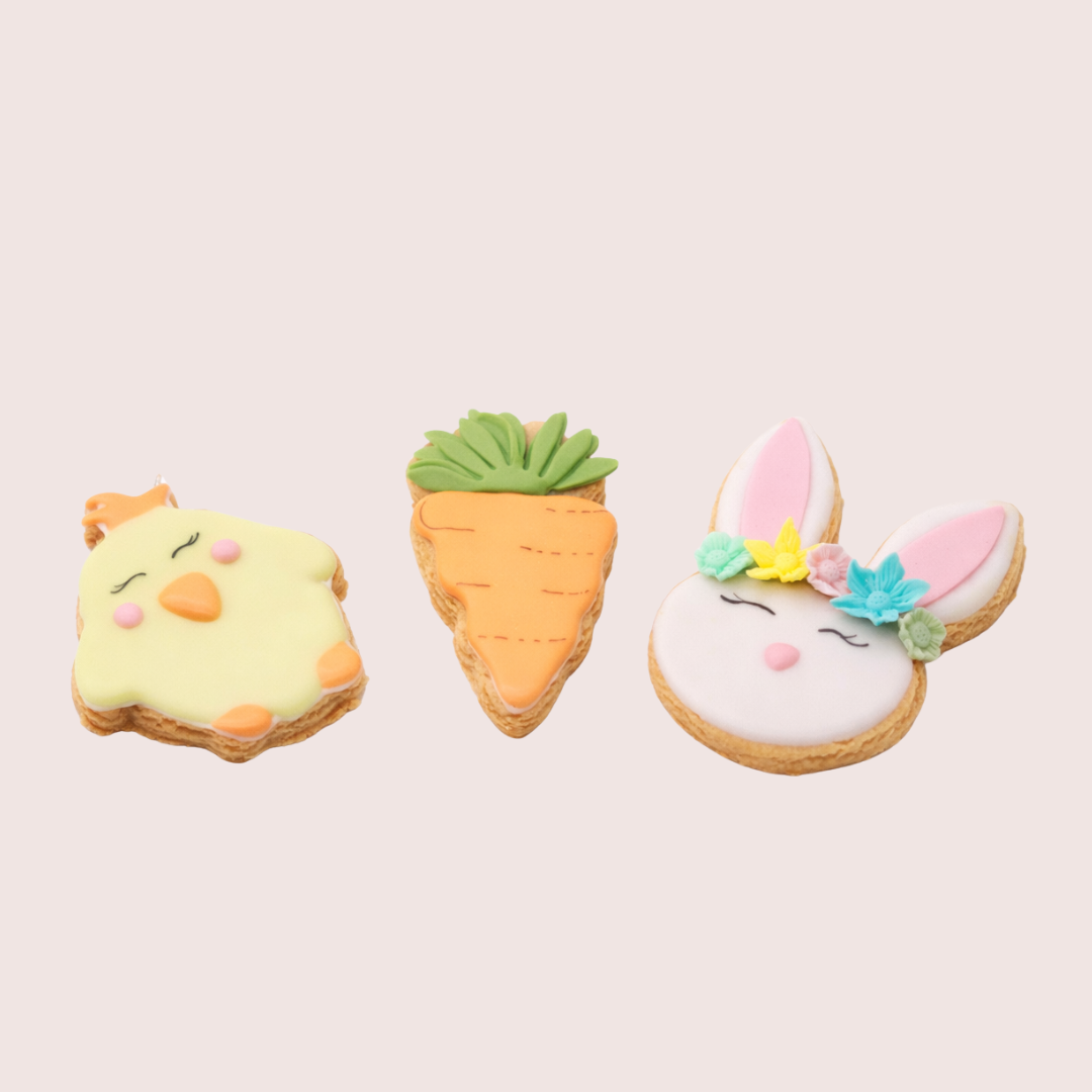 Celebrate Easter with our beautifully handcrafted Easter Sugar Cookie Trio, a charming set of three decorated cookies featuring a cute Easter chick, carrot, and bunny design. Each cookie is freshly baked using our buttery vanilla sugar cookie recipe and topped with smooth royal icing in soft pastel colours.