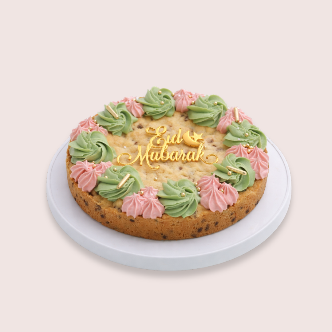 Celebrate Eid with our Eid Mubarak Giant Chocolate Chip Cookie Cake — a beautifully decorated oversized chocolate chip cookie designed for sharing. Baked golden on the outside and soft and chewy in the centre, this giant cookie cake is topped with pastel buttercream swirls in blush pink and sage green, finished with gold accents and an elegant Eid Mubarak topper.