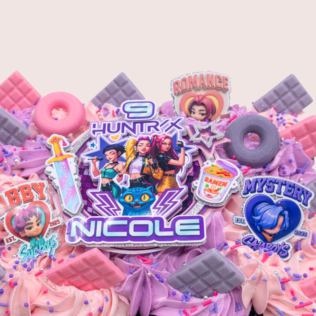 At the centre, a custom topper showcases your child’s name and age alongside their favourite K-POP Demon Hunters characters, making it the ultimate personalised showstopper for any party.