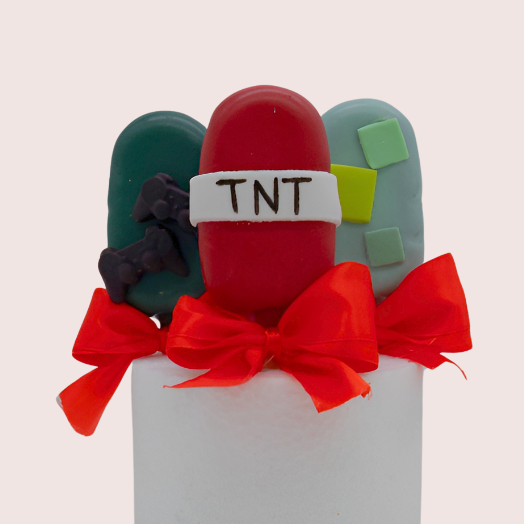 These bold and blocky cakesicles are inspired by the iconic world of Minecraft — the land of creepers, crafting tables, and unstoppable creativity. Each treat is hand-decorated with signature game elements like TNT sticks, creeper pixels, and controller-inspired details, bringing that unmistakable Minecraft charm to every bite. Finished with bright red satin bows, they’re as festive as they are delicious.