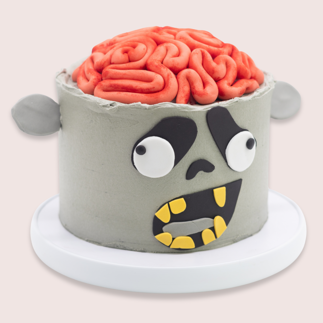 Get ready for a frightful feast with our Zombie Cake — complete with gooey fondant “brains” and a goofy grin that’s more silly than scary. This undead delight is the perfect centrepiece for your Halloween table, guaranteed to thrill kids and grown-ups alike.